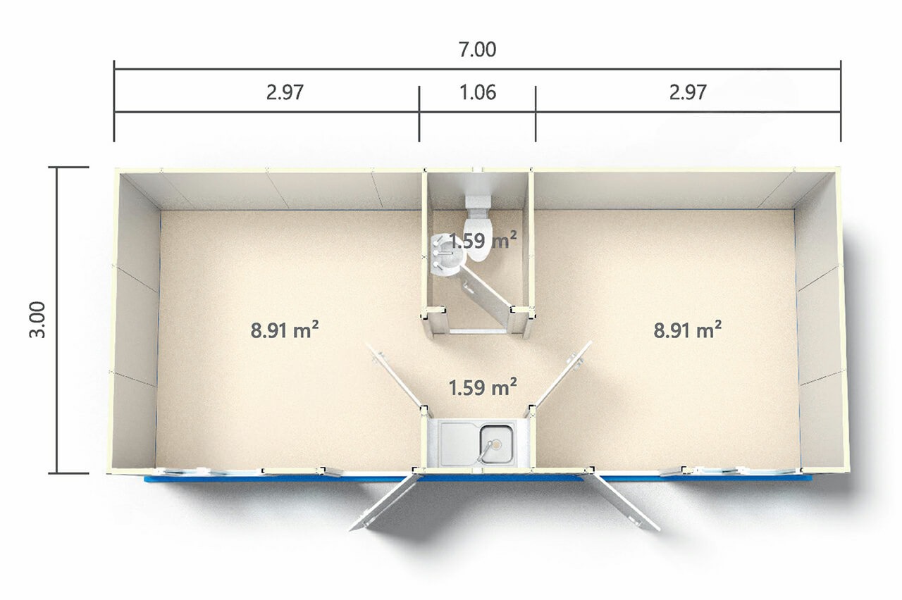 Kontajnery možno vybaviť elektroinštaláciou, sanitou, klimatizáciou či zateplením podľa účelu využitia. Rôzne rozmery a konfigurácie umožňujú vytvoriť samostatné moduly aj väčšie zostavy – presne podľa potrieb vášho projektu.